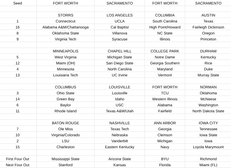 I'm back with my inaugural women’s bracketology of the season. Connecticut and UCLA are the obvious top 2 seeds, but there’s some intrigue behind them. Texas grabs the third 1 seed thanks to wins over UCLA and South Carolina, while the Gamecocks grab the last 1 seed thanks to their road win at LSU yesterday.