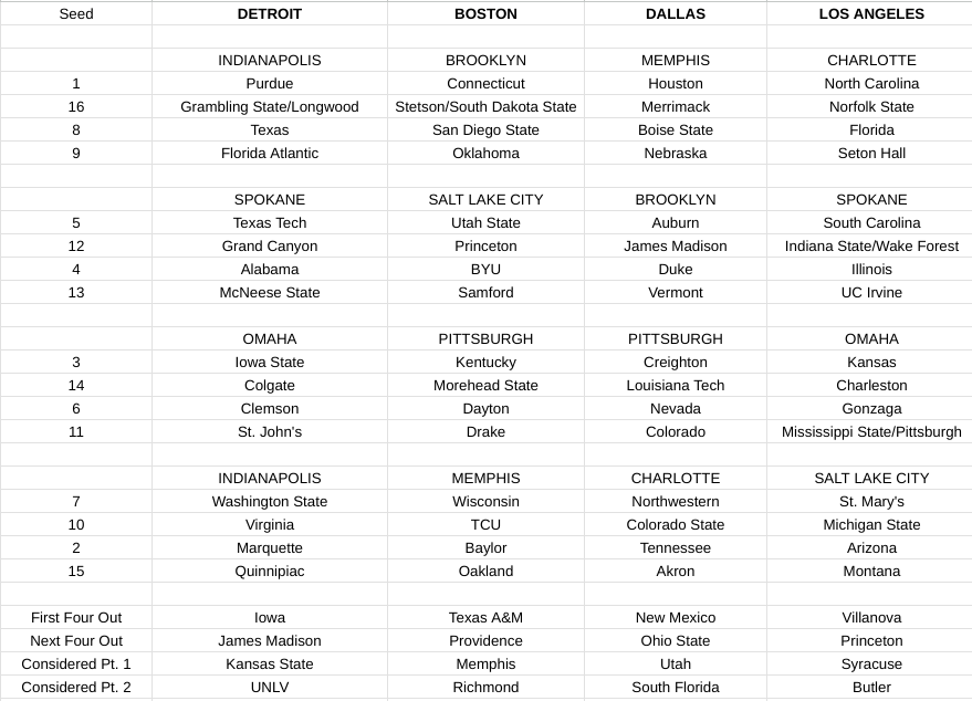 Nearly every team on the seed list played over the weekend and changes abound up and down the bracket. At the top, North Carolina won on the road at Duke and Tennessee lost to Kentucky, leading to the Heels taking over as the last 1 seed. On the bubble, New Mexico, Villanova, Iowa, Mississippi State and Providence all lost, opening the door for some other teams. I have very reluctantly moved Wake Forest and Pittsburgh in as my last two teams in, but I don’t feel great about it. They are likely to match up in the ACC quarterfinals and that looks like a must-win game for both.